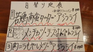 今日は、限定15食で海鮮漬け6種盛り合わせとマグロ尾の身唐揚げと鶏唐揚げの入った定食が特にオススメです